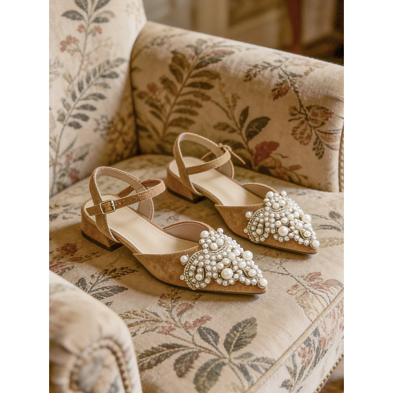 Women's Elegant Pearl-Embellished Flat Shoes with Ankle Strap – Stylish Suede Pointed-Toe Ballet Flats for Weddings, Formal Events and Everyday Wear