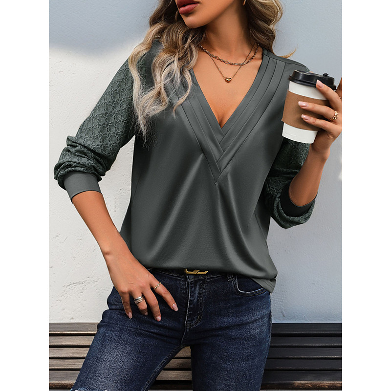 Women's Elegant Lace Tops Eyelet Blouse Stylish Modern Solid Color Lace Ruched Long Sleeve V Neck Work Romantic Petite Tops Summer Holiday Wear Gray Spring Fall Winter