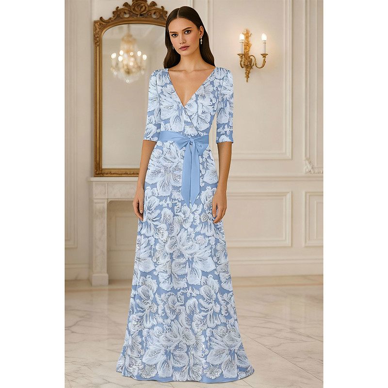 A-Line Floor Length Beaded Eembroidered Formal Dresses Mother of the Bride Dress Evening Gown Ball Gown Formal Dress Elegant Glittering 3/4 Length Sleeve V Neck Wedding Formal Pocket Satin Lace with