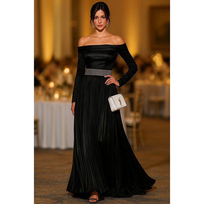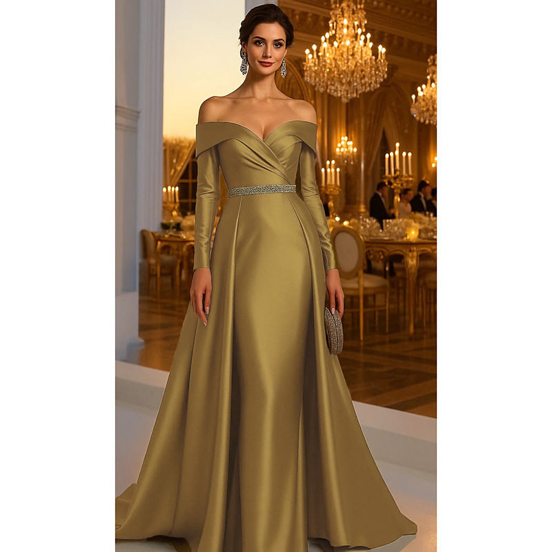 A-Line Floor Length Evening Gown Ball Gown Formal Dress Elegant Silky Long Sleeve Off Shoulder Wedding Formal Satin with Pleats