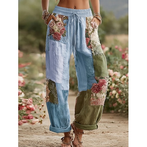 Per donna Pantaloni ispirati al lino Gamba larga Pantaloni Stile Etnico Casual Boho Lunghezza intera Vita Alta Floreale Grafico Tasca Elastico in vita Stampa Traspirabilità Morbido Micro-elastico