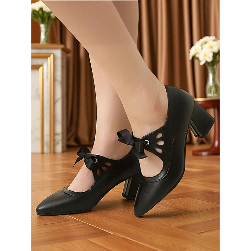 Women's 1950s Style Red Mary Jane Heels with Bow – Retro Cutout Chunky Heel Pumps for Daily Vintage Wear and Swing Dance