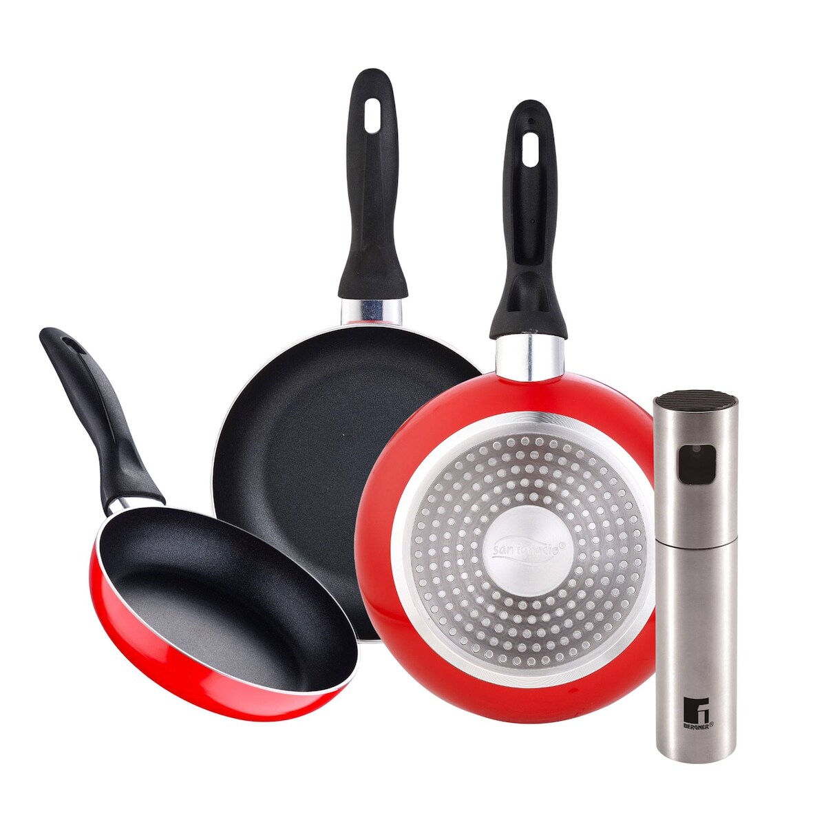 BERGNER - Set aus 3 Pfannen Ø16/Ø20/Ø24 cm aus gepresstem Aluminium, geeignet für Induktion Navy Red Öl-/Essigsprüher Ø4x17,5 cm aus Edelstahl