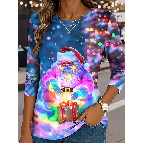 Natale Per donna Maglietta Grafico Babbo Natale Vintage Moda Elegante Manica Lunga Girocollo Top Regolari Quotidiano Weekend Stampato Blu Rosso Viola Fucsia Verde Estate Primavera Autunno Inverno