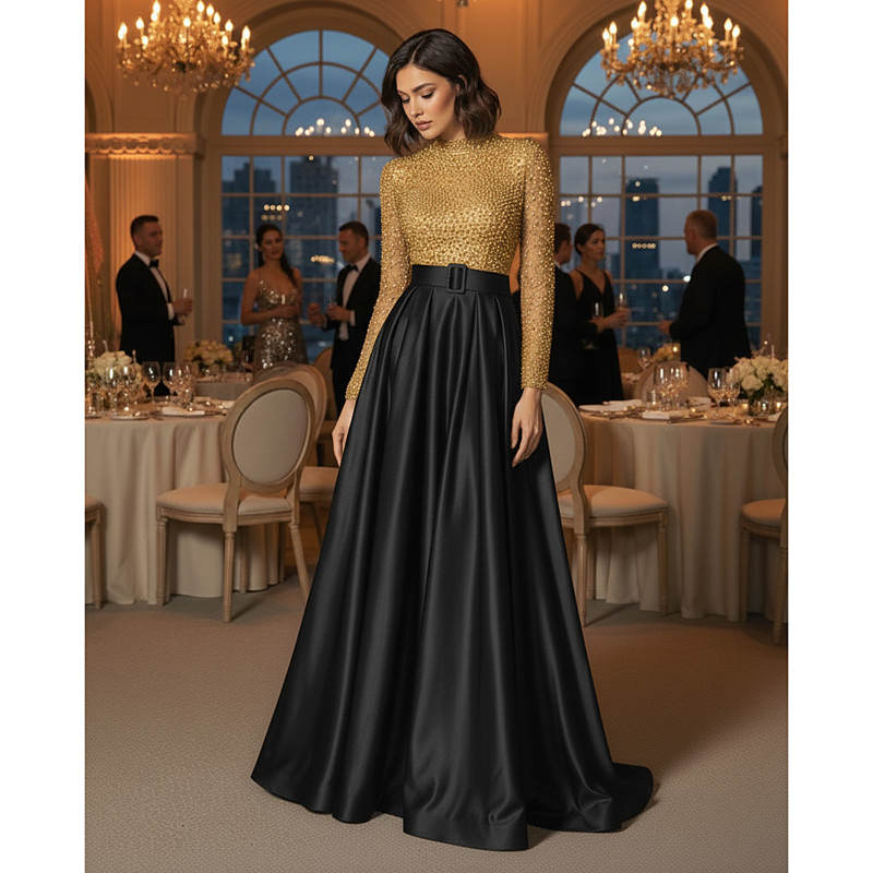 A-Line Court Train Floor Length Evening Gown Ball Gown Formal Dress Elegant Sparkle Shine Long Sleeve High Neck Evening Party Christmas Fall Wedding Guest Satin Sequined with Sequin