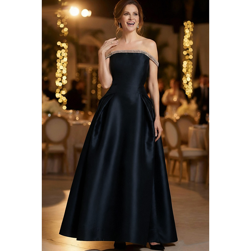 A-Line Floor Length Evening Gown Ball Gown Formal Dress Elegant Sleeveless Off Shoulder Evening Party Wedding Satin with Rhinestone