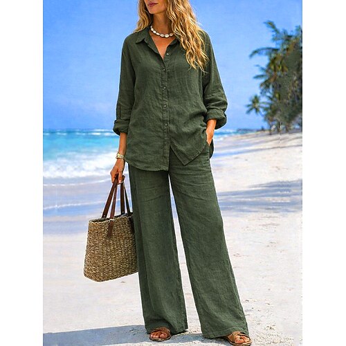 Per donna Set di Pantaloni Bolero Finto cotone e lino Manica Lunga Colletto a Camicia Tinta unica Moda Streetwear Casuale Quotidiano All'aperto Blu Nero Bianco Estate Vestibilità comoda