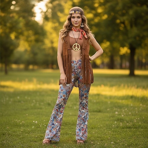 Set Retrò Vintage Anni '70 Abiti Gilet Pantaloni a zampa d'elefante con accessori Hippie Costume Per donna Halloween Carnevale Casual Quotidiano Festival Musicale Adulti Cravatta Top Pantaloni