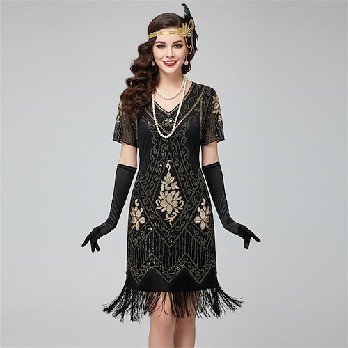 Retrò Vintage Anni Ruggenti Anni 1920 Mini Abito Flapper Abiti Set di accessori Senza maniche Il grande Gatsby Invitato al matrimonio Paillettes Frangia con nappe Paillettes Nappa Scollo a V Costume