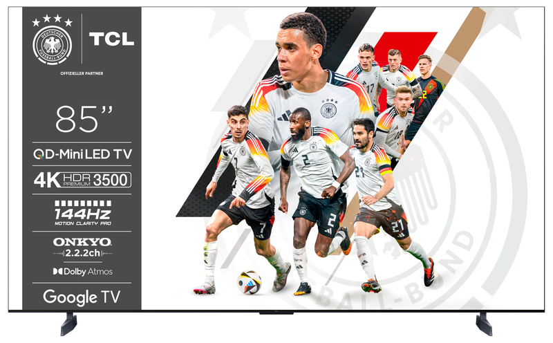 TCL 85C855 85 Zoll QLED Mini LED Fernseher, QLED PRO, 4K HDR Premium 3500 Nits, Smart TV mit Google TV (Dolby Vision & Atmos, Onkyo 2.2.2 Soundsystem, 144Hz Motion Clarity Pro, Freihändige Sprachsteuerung, kompatibel mit Google Assistant & Alexa)