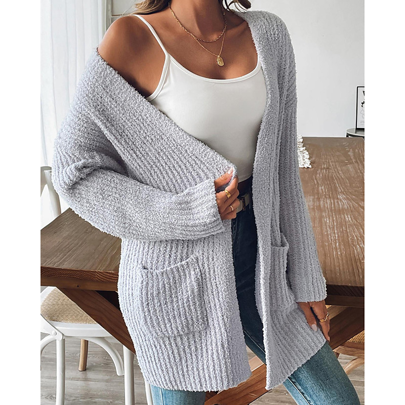 Women's Sweater Cardigan Casual Soft Pure Color Ribbed Open Front Pocket Knitted Long Sleeve Long Tops Knit Outdoor Daily Weekend Khaki Beige Fall Winter