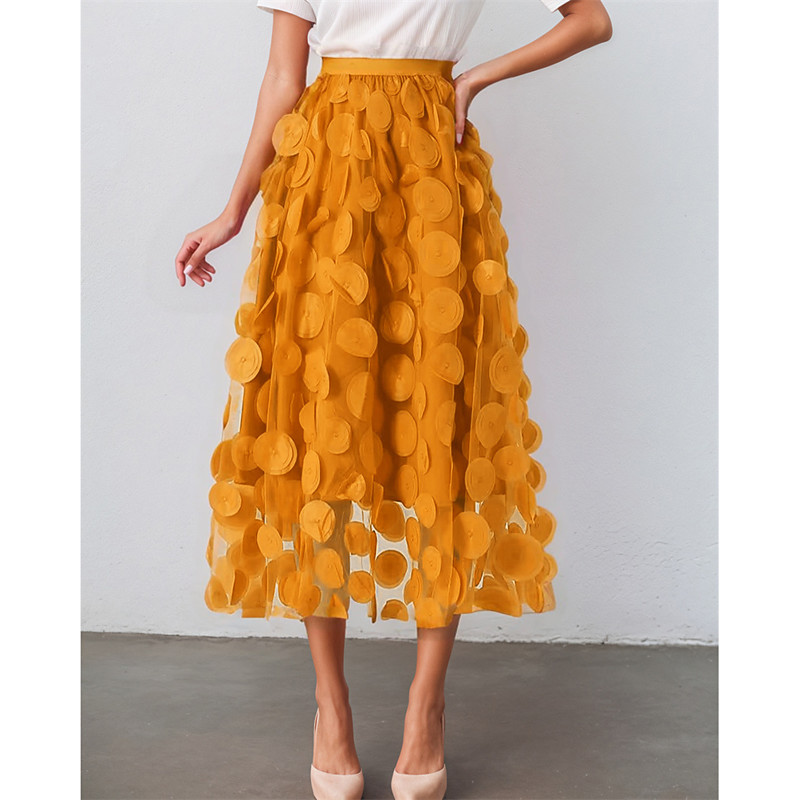 Women's Asian Size A Line Gauze Skirts Elegant Fashion Midi High Waist Skirts Solid Colored Flower Floral Tulle Micro-elastic Family Gathering Casual Daily Apricot Wine Red Black White Spring, Fall