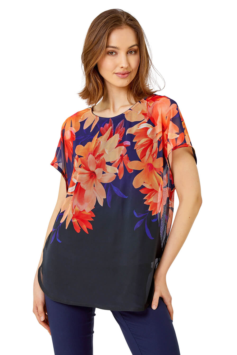 Roman Womens Floral Print Elasticated Hem Top - Blue - Size 12 UK | Roman Sale | Discount Designer Brands