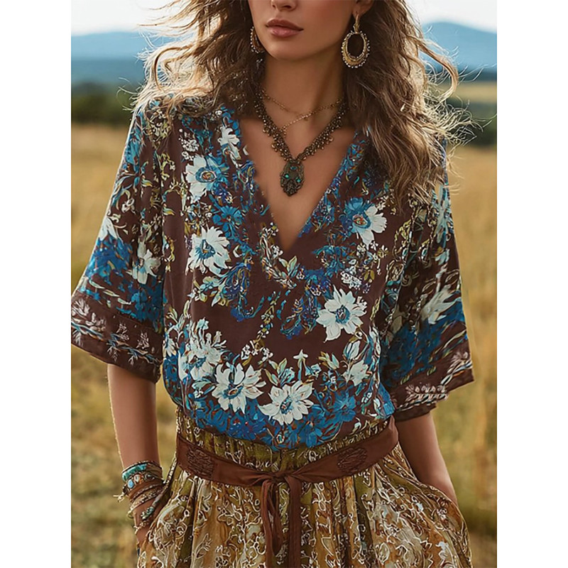 Women's T Shirt Floral Graphic Plants Vintage Stylish Classic Half Sleeve V Neck Regular Tops Daily Weekend Vacation Wear Print Brown Summer Spring