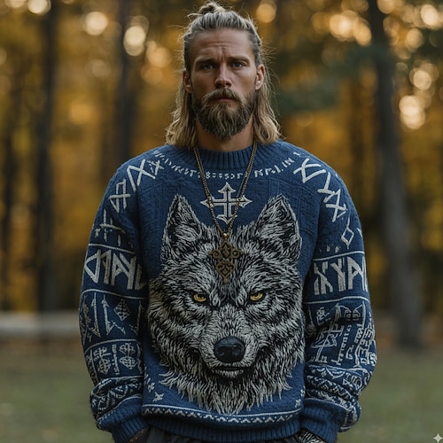 Per uomo Animale Lupo Vichingo Maglione Maglieria Girocollo Retrò Vintage Casual Vacanza Quotidiano Stampa 3D Lavoro a maglia Tenere al caldo Manica Lunga Primavera Autunno Inverno Blu Marrone Verde