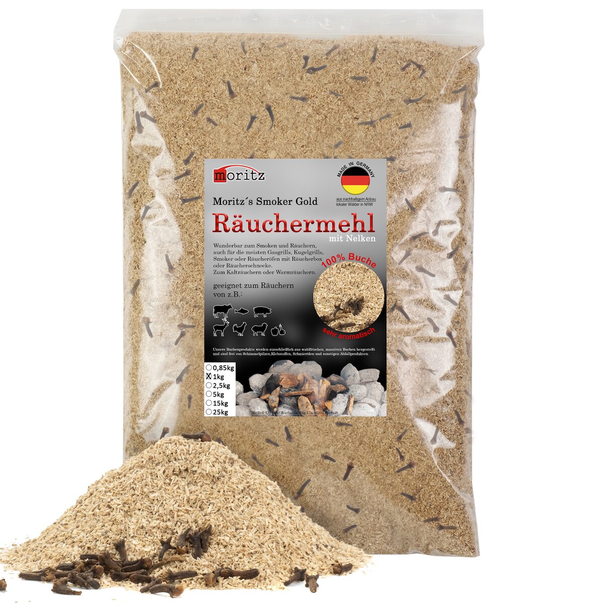 Moritz 1kg Räuchermehl Buche mit Nelke fein 0,5 -1 mm Räuchern I Kalträuchern von Fisch Fleisch Wurst Käse Gemüse auch für BBQ I Grill - Räucherspäne
