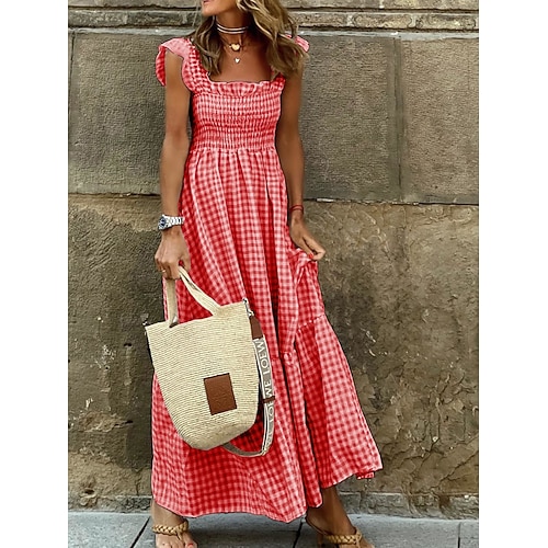 Per donna Abito maxi Abito a trapezio Abito Sottoveste Vacanza Casual All'aperto Uscire Vestibilità regolare Plaid Senza Maniche Spalline sottili Nero Rosso Azzurro cielo Beige Estate Primavera