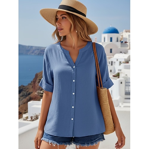 Per donna Camicia Camicia button-down Camicia casual Blusa Bottoni Semplice Elegante Classico Moderno Manica Corta Scollo a V Top Regolari Quotidiano Ferie Uscire Blu Nero Bianco Verde militare Beige
