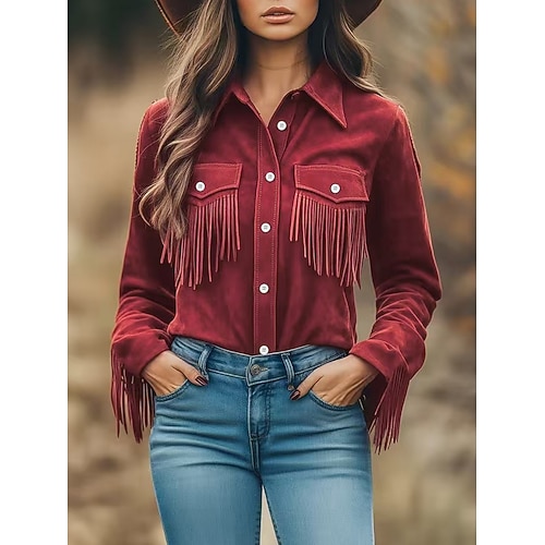 Per donna Camicia Camicia button-down Camicia casual Blusa Bottoni Frange Semplice Elegante Western Casual Manica Lunga Colletto a Camicia Top Regolari Quotidiano Ferie Uscire Blu Nero Rosso