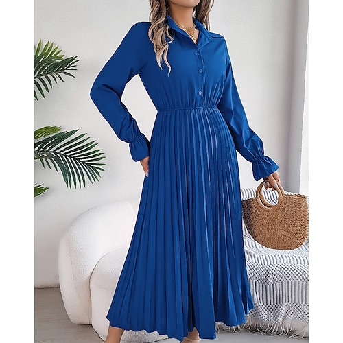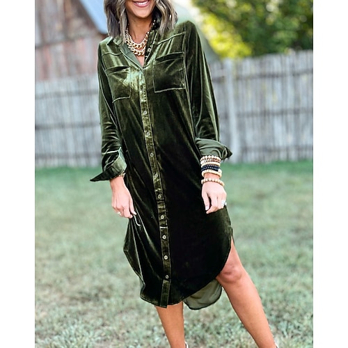 Per donna Abito Midi Abito in Velluto Abito Camicia Moderno All'aperto Vacanza Uscire Vestibilità regolare Semplice Manica Lunga Colletto a Camicia Nero Vino Verde militare Primavera Autunno