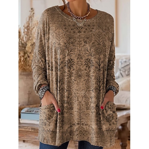 Per donna Maglietta Floreale Grafico Piante Vintage Moda Elegante Manica Lunga Girocollo Top Regolari Quotidiano Uscire Weekend Tasca Stampato Blu Rosso Viola Verde Cachi Primavera Autunno Inverno