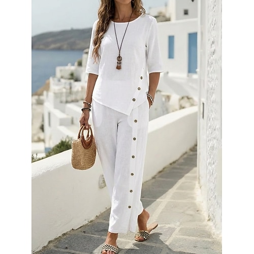 Per donna Set da due pezzi Set di Pantaloni Finto cotone e lino Mezza Manica Girocollo Semplice Moda Streetwear Casuale Quotidiano All'aperto Nero Bianco Verde Primavera Estate Vestibilità regolare