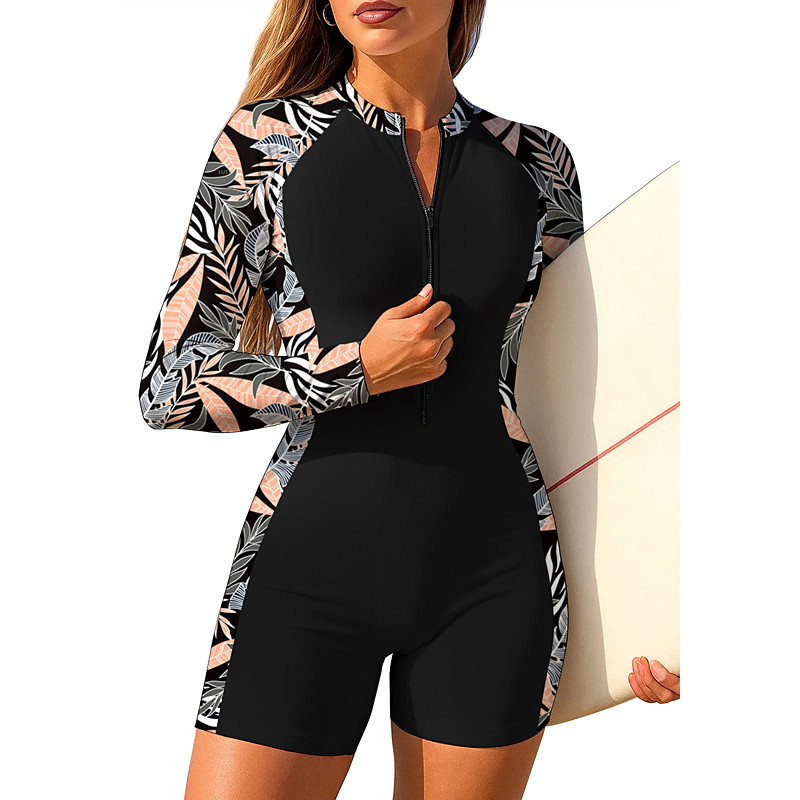 Women's Rash Guard One Piece Surfing Suit Bathing Suit Floral Tropical Color-blocking UV Sun Protection UPF50 Ultra Light (UL) Long Sleeve Swimwear Sun Shirt Zip Up with Built in Bra Removable Pad