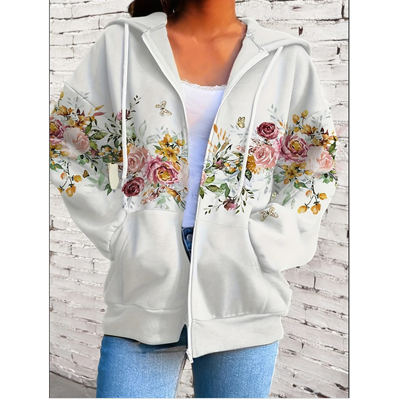 Women's Hooded Sweatshirt Jacket Long Sleeve Zip Up Hoodie With Pocket Lightweight Casual Micro-elastic Floral Graphic Fashion Street Dailywear Pocket Print White Purple Fuchsia Spring Fall
