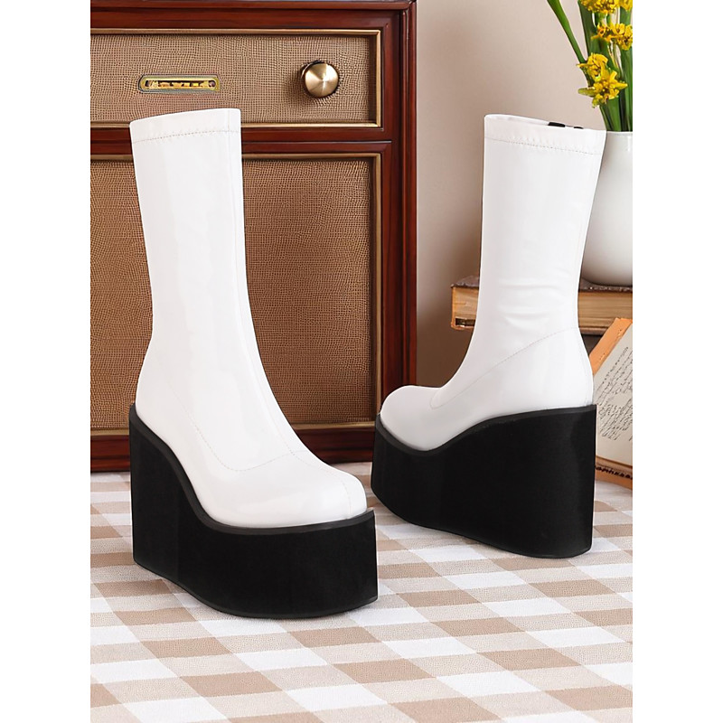 Women's 1980s Red Patent Platform Wedge Go-Go Boots – Retro Shiny Ankle Boots for Parties, Stage Shows, and Halloween Costumes