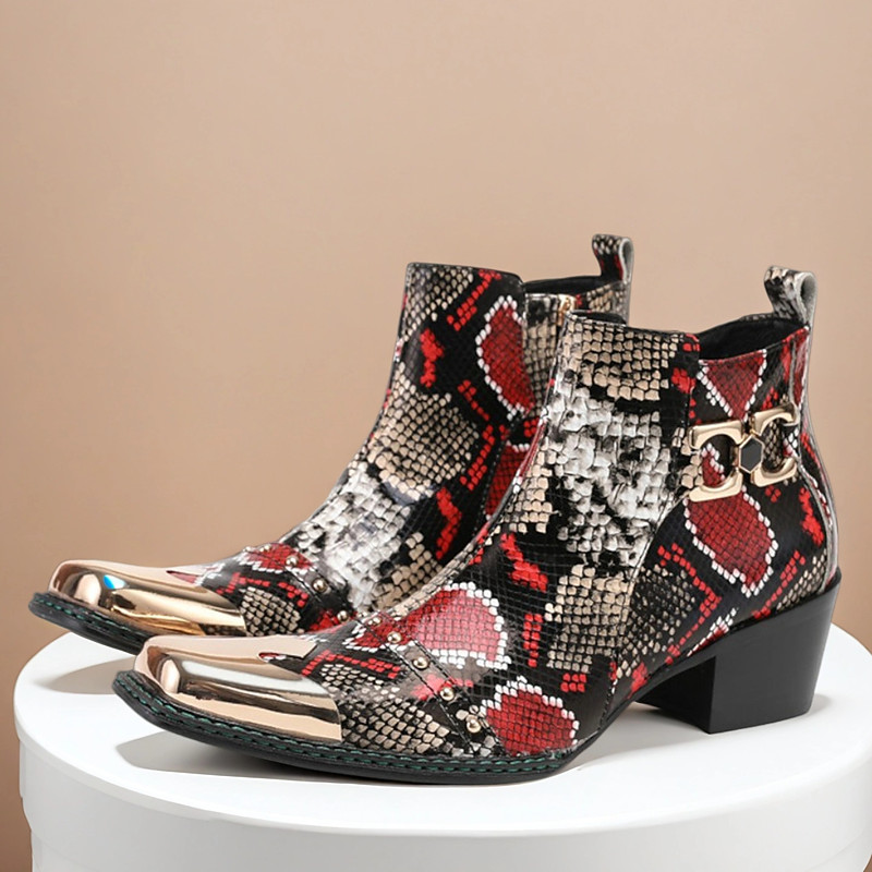 Men's Red and Black Snake Print Leather Boots – Exotic Pointed Toe Ankle Boots with Metal Cap for Weddings, Gatsby Parties and Evening Outfits