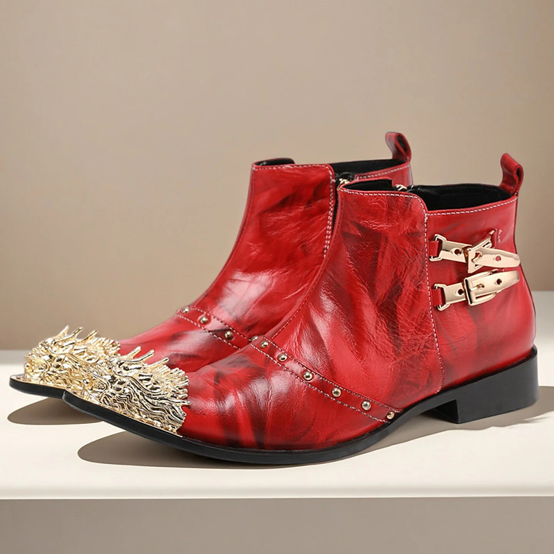 Red Genuine Leather Men's Western Style Boots with Gold Buckle – Luxurious Footwear for Christmas and New Year's Eve Celebrations