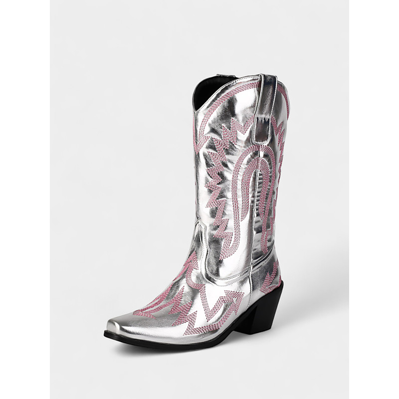 Women's Red Patent Faux Leather Cowboy Boots with Glittering Embroidery, Western Style, Chunky Heel, Perfect for Christmas, Country Music Events and Holiday Celebrations