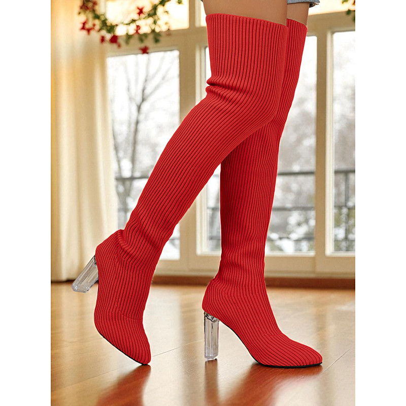 Women's Red Ribbed Knit Over-the-Knee Boots with Clear Block Heel, Stylish Pointed Toe, Perfect for Christmas, Holiday Events and Fashion-Forward Occasions