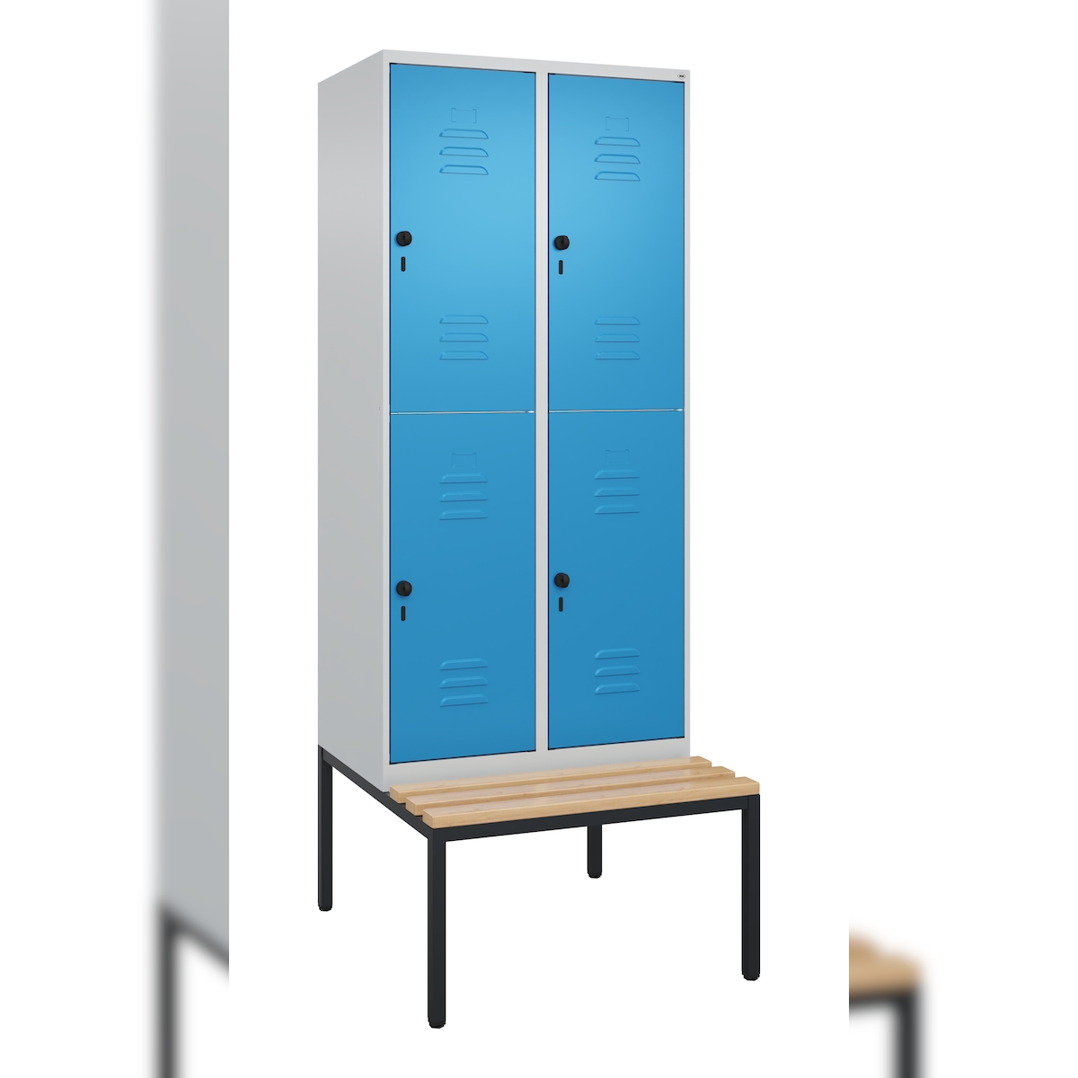 C+P Spind Classic PLUS, Buche untergebaute Sitzbank-Harthol, 4 Abteile, HxBxT 212x80x82cm, Sicherheitsdrehriegel, Hellgrau/Lichtblau von PROREGAL