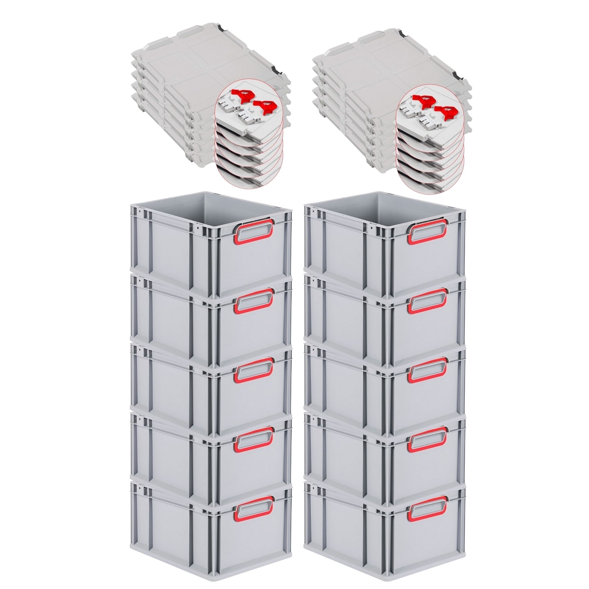 PROREGAL 10x Eurobox NextGen Color mit Scharnierdeckel & Verschlüssen | HxBxT 22x30x40cm | 20 Liter | Griffe rot geschlossen | Glatter Boden