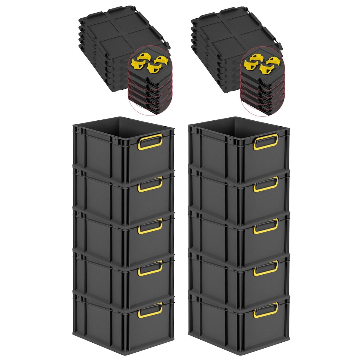 PROREGAL SparSet 10x Eurobox NextGen Color mit Auflagedeckel & Verschlüsse, HxBxT 22x30x40cm, 20L, Schwarz, Griffe gelb zu, Eurobehälter