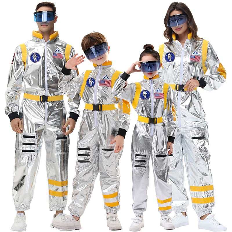 Couples Astronaut Costume Jumpsuit Carnival Costume Onesie with Mask Group Costumes Silver Space Suit for Men Women with Embroidered Patches