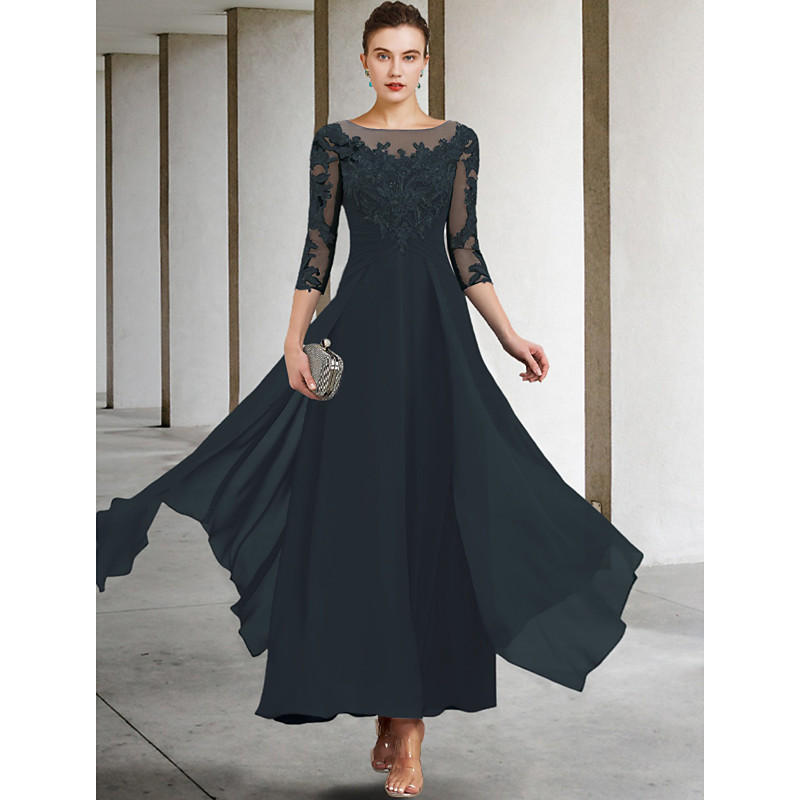 A-Line Ankle Length Party Dress Cocktail Dress Wedding Guest Dress Mother of the Bride Dress 3/4 Length Sleeve Jewel Neck Elegant Plus Size Wedding Guest Wedding Party Chiffon Lace with Ruched Sequin