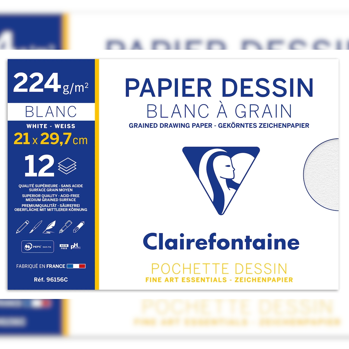Clairefontaine 10x Gekörntes Zeichenpapier, Packung mit 12 Blatt A4, 224g, weiß - 96156C