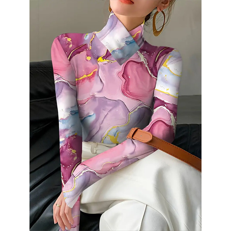 Women's T Shirt Graphic Abstract Elegant Vintage Stylish Long Sleeve High Neck Asymmetric Neck Regular Tops Daily Print Tiered Black and White Pink Brown Spring Fall Winter