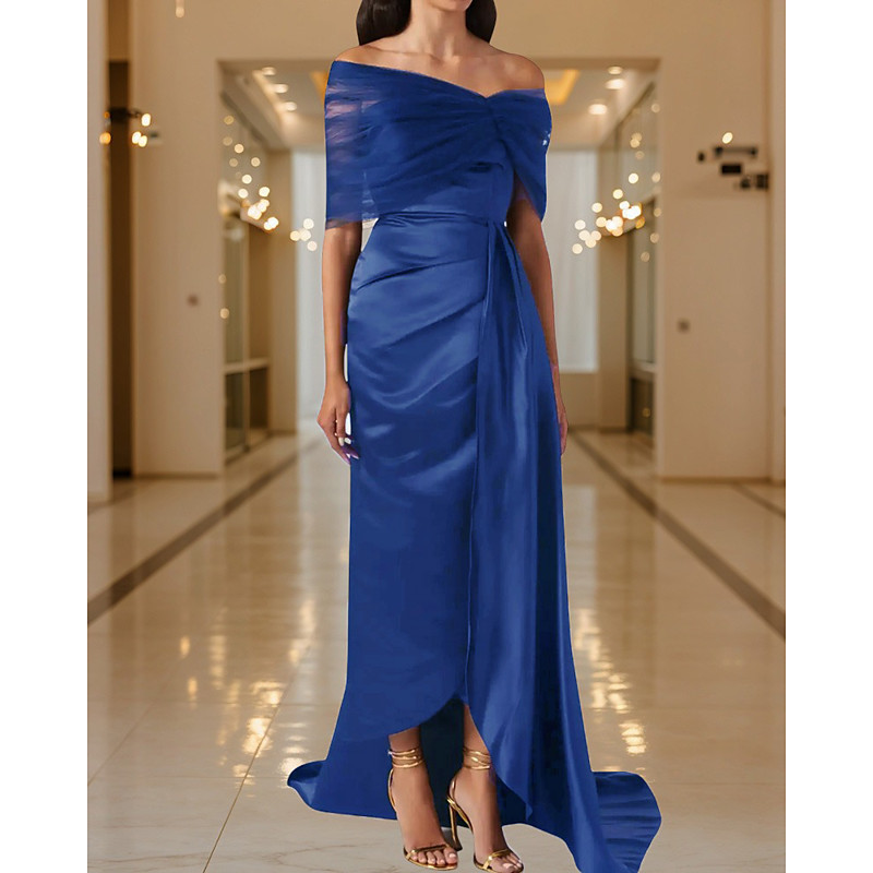 A-Line Mermaid Trumpet Sweep Brush Train Evening Gown Ball Gown with Overskirt Formal Dress Elegant Celebrity Style Sleeveless Off Shoulder Garden Party Wedding Tulle Stretch Satin with Pleats