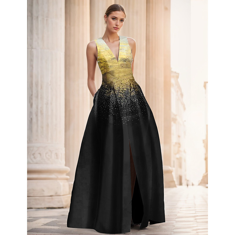 A-Line Floor Length Evening Gown Ball Gown Formal Dress Elegant Celebrity Style Sleeveless V Neck Garden Party Wedding Satin with Slit Pocket