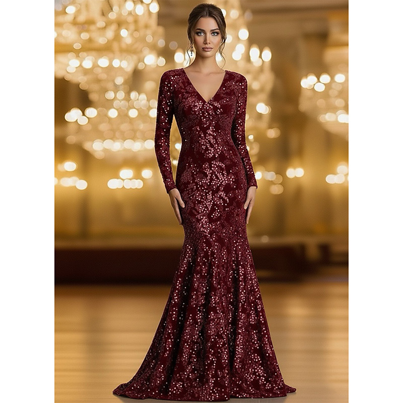 Mermaid Trumpet Floor Length Beaded Eembroidered Formal Dresses Mother of the Bride Dress Prom Dresses Evening Gown Ball Gown Formal Dress Elegant Glittering Celebrity Style Long Sleeve V Neck Garden
