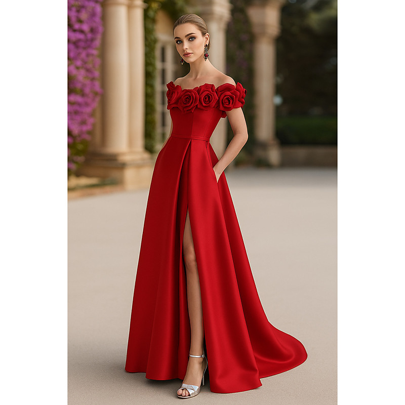 A-Line Floor Length Evening Gown Ball Gown Formal Dress Elegant Sleeveless Off Shoulder Wedding Formal Pocket Satin with Pleats Slit Shouder Flower