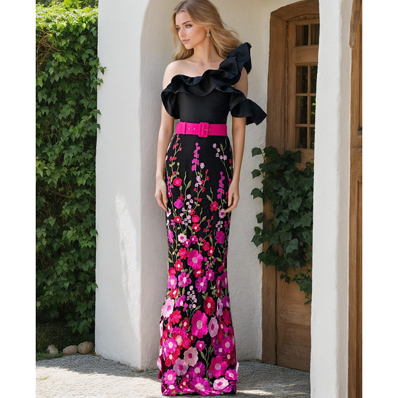 Jumpsuits Floor Length Evening Gown Ball Gown with Overskirt Formal Dress Elegant Minimalist 3/4 Length Sleeve Off Shoulder Wedding Guest Wedding Party Pocket Stretch Fabric with Embroidery