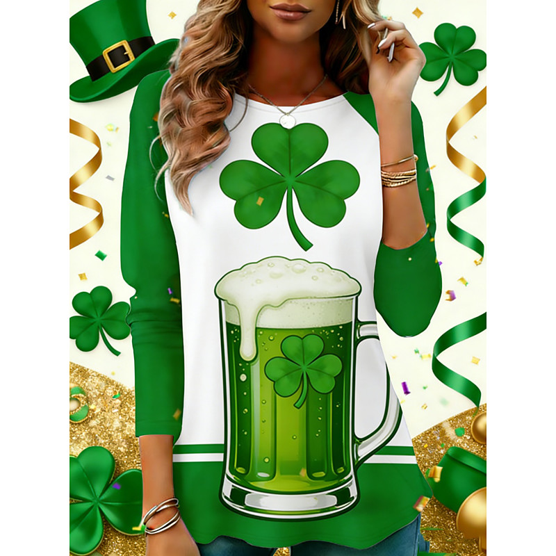 St. Patrick's Day Women's T Shirt Tee Top Graphic Shamrock Beer Fashion Stylish Classic Long Sleeve Crew Neck Regular Tops Daily Weekend Vacation Wear Print Green Spring Fall