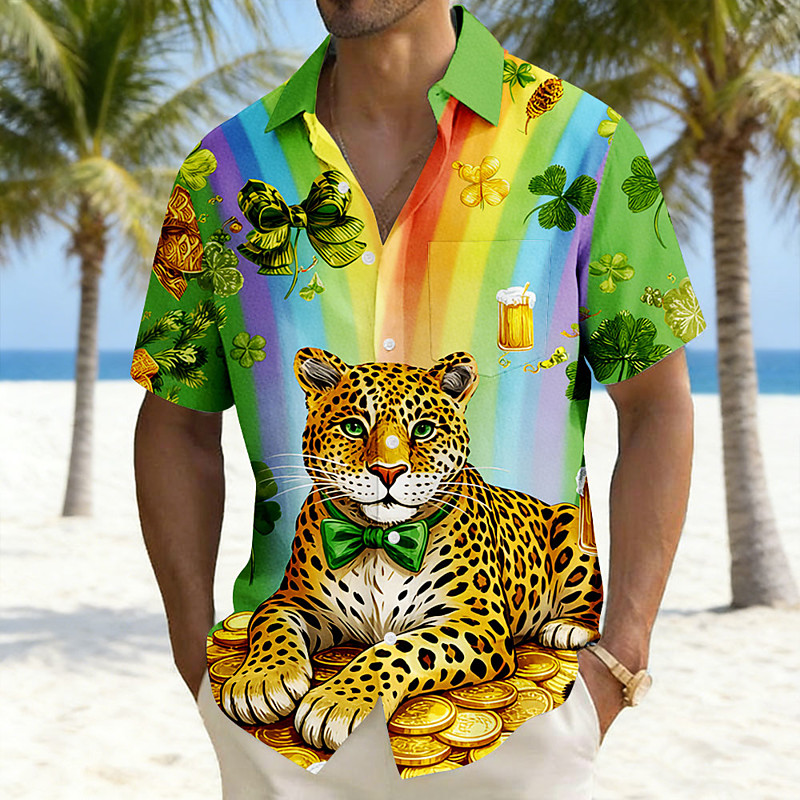 St. Patrick's Day Men's Leopard Shamrock Beer Shirt Summer Shirt Button Up Shirt Short Sleeve Vintage Retro Holiday Summer Turndown 3D Print Front One Pocket Linen Like Shirt Green