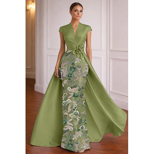 Linea ad A Tubino Colonna Lunghezza al pavimento Abito da Sera Abito da ballo con sopragonna Elegante Scintillante Floreale Manica Corta Scollo a V Festa serale Festa in giardino Raso Shiena scoperta
