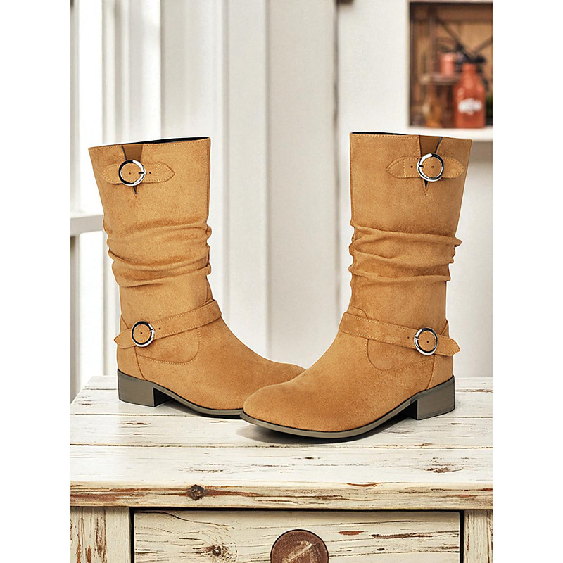 Women's Mid Calf Slouchy Boots with Buckle Straps – Vintage Suede Style Winter Boots for Casual Outfits and Autumn Fashion