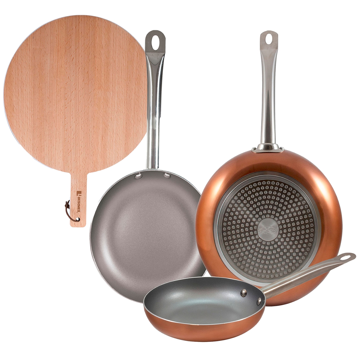 BERGNER - Set aus 3 gepressten Aluminium-Pfannen Ø18/Ø22/Ø26 cm, geeignet für Induktion Optimum Plus Rundes Schneidebrett 38x28x1,5 cm aus Buchenholz